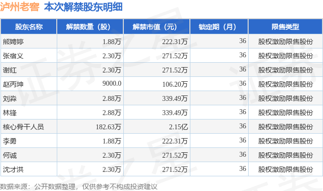 证券之星消息,根据市场公开信息整理,泸州老窖(000568)于2月24日将有202.25万股限售股份解禁,为公司股权激励限售股份,占公司总股本0.14%。(本次数据根据历史公告整理得出,实际情况以上市公司最新公告为准)最近一年内,该股累计解禁17.16万股,占总股本的0.01%。本次解禁后,公司还有260.61万股限售股份,占总股本0.18%。具体如下图所示: